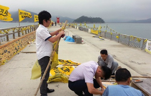 세월호 진도군대책위 관계자는 "팽목항 주민들의 철거 요구 민원으로 유가족, 실종자 가족과 협의해 추모 리본 등을 함게 철거했다"고 말했다.
