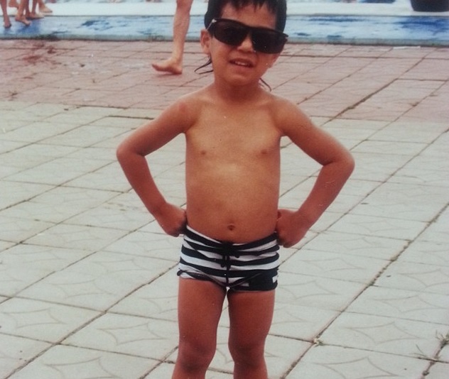 얼굴을 가린 검정색 선글라스를 통해 범상치 않았던 어린시절을 엿볼 수 있다.
