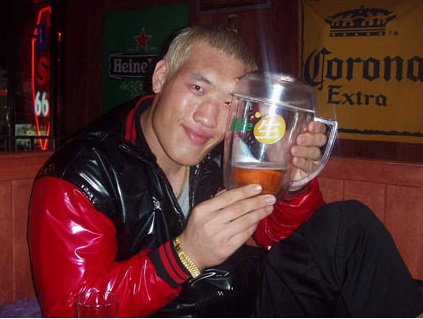 최홍만은 사진 속에서 보통 사람보다 훨씬 큰 손과 얼굴을 자랑하며 맥주 피처잔을 들고있다.