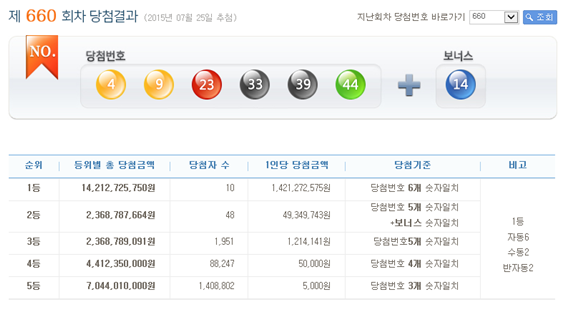 660회 로또 당첨번호는 '4, 9, 23, 33, 39, 44'로 보너스 번호는 '14'다.