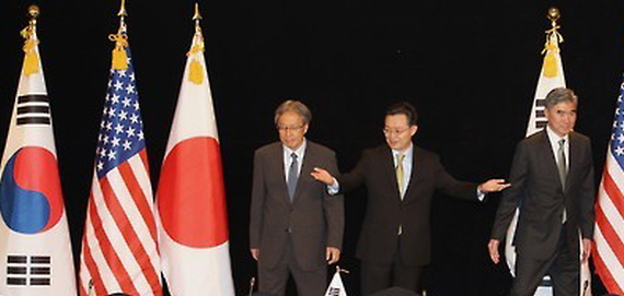 | ▲이란 핵협상 타결 이후 한미일 3국은 오는 31일 일본 도쿄에서 북핵 6자회담 차석대표 회담을 열기로 했다. 사진은 지난 5월27일 서울 소공동 롯데호텔에서 열린 한미일 6자회담 수석대표 회의에서 황준국 외교부 한반도평화교섭본부장(가운데), 성 김 미국 국무부 대북정책 특별대표(오른쪽), 이하라 준이치 일본 외무성 아시아대양주 국장이 포토세션을 마치고 각자 자리로 향하고 있다./사진=연합뉴스 |