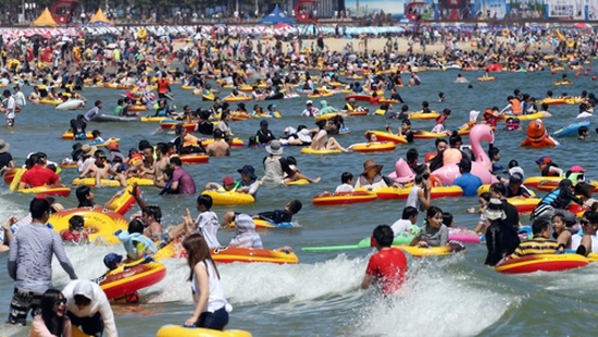 | ▲ 퇴근길도 '후끈' 뜨거운 부산 …합천 37도 훌쩍 주말날씨도 화끈~.26일 부산 해운대해수욕장에서 피서객들이 물놀이를 하면서 더위를 식히고 있다. /사진=연합뉴스 |