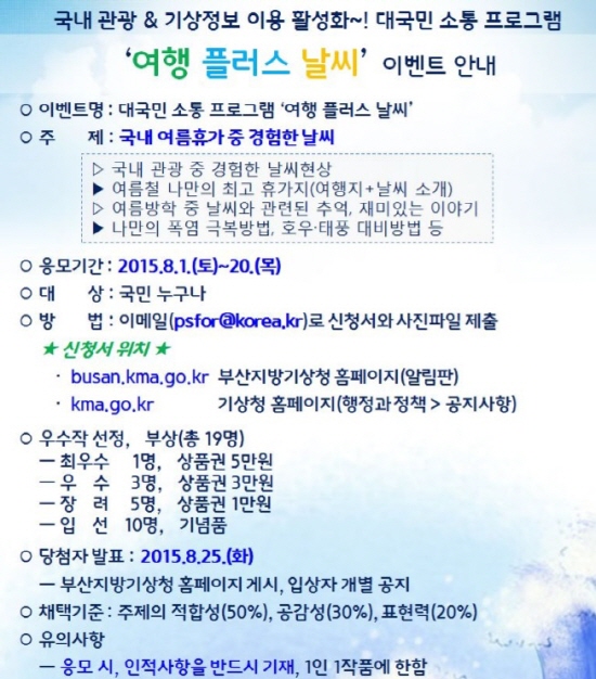 [미디어펜=이상일 기자] 부산기상청은 여름 휴가철을 맞아 메르스 여파로 침체된 국내여행을 권장하고 지역 관광산업을 활성화를 위해 ‘여행 플러스 날씨’ 이벤트를 추진한다고 30일 밝혔다.