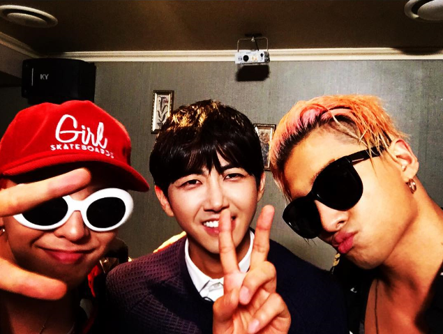 사진에는 GD와 태양 사이로 무한도전 멤버 광희가 함께 한 모습이 담겨 있다. GD와 광희의 V자 포즈와 함께 세 사람은 카메라를 향해 미소지으며 다정한 모습을 보이고 있다.