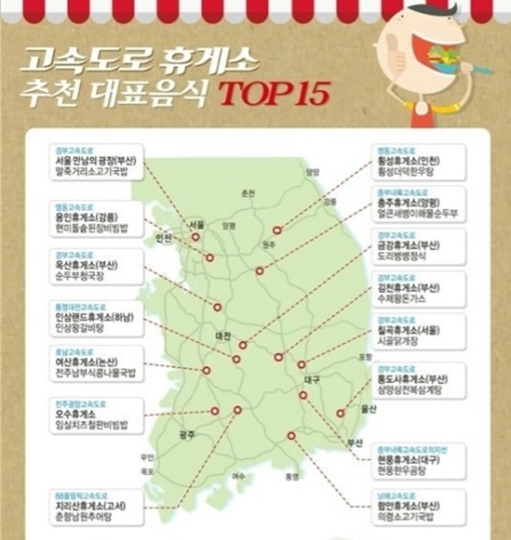 헌푠 정체되는 고속도로 교통상황과 장거리 운전 준 고려사항으로 지친 피서객들을 위해 최근 한국도로공사측은 '고속도로에서 가장 많이 팔린 음식·추천 대표음식 15가지’ 지도를 공개했다.