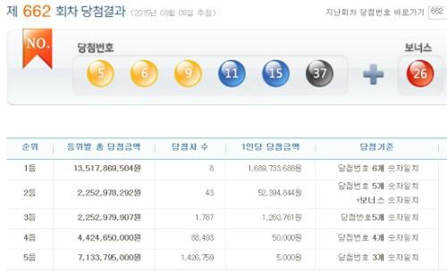 8일 로또 제 662회 1등 당첨번호는 '5·6·9·11·15 37'번으로 결정됐다. 2등 보너스번호는 '26'번이다. 1등 당첨자 8명중 로또복권 구입방식은 자동 6명·수동 2명인 것으로 밝혀졌다.