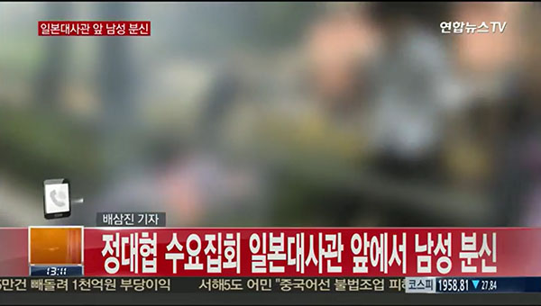 | ▲ 일보 대사관 앞 분신 남성, 3도 화상 치료중/연합뉴스 영상 캡처 |