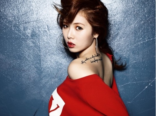 사진 속 현아는 등이 파인 레드 티셔츠 차림에 선명한 레드립스틱을 바르고 뒤를 돌아보는 포즈를 취하고 있다.