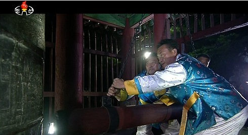 | ▲ 사진/북한은 15일 0시를 기해 기존 표준시인 동경시보다 30분 늦은 평양시를 사용한다. 조선중앙TV는 이를 기념하기 위해 평양시 중구역 대동문에 있는 연광정에서 열린 타종행사를 보도했다. 조선중앙TV가 날이 바뀔 때 타종행사 장면을 방영하는 것은 매우 이례적인 일이다./연합뉴스 |