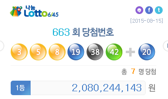 [미디어펜=이상일 기자] 광복절인 15일 나눔로또 663회 로또복권 추첨에서 1등 당첨번호는 '3,5,8,19,38,42'가 뽑혔다. 2등 행운의 보너스 번호는 20이다.