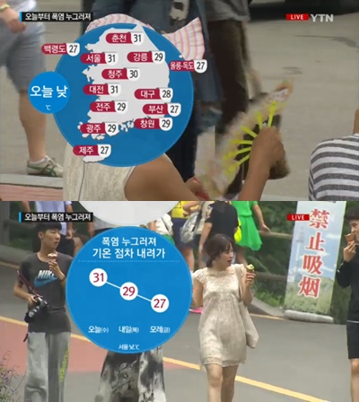 이밖에 전국적으로 낮 기온은 어제보다 1~2도 가량 낮겠다. 대전 31도, 광주 29도, 대구 28도, 부산 27도로 대부분 30도 안팎으로 예상된다.