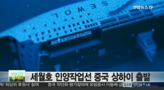 | ▲ 19일 해수부 등이 인양 조사작업에 착수한 세월호는 맹골수도 수심 약 44m 지점에 뱃머리를 동쪽으로 두고 좌측면이 바닥에 닿은 채 누워 있다. 6825t급인 세월호는 수중에서 약 8500t의 무게일 것으로 추정된다./사진=연합뉴스 TV 캡처 |