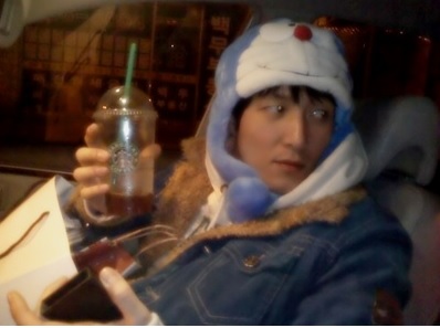 심형탁은 사진 속에서 얼굴을 감싸는 도라에몽 모자를 쓴체 한손에는 테이크 아웃 커피를 들고있다.