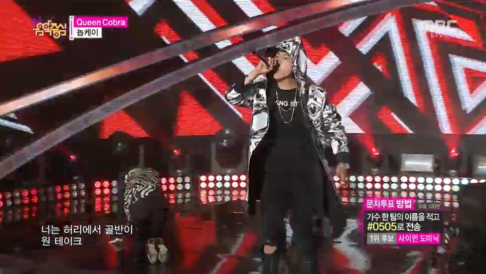 22일 MBC ‘음악중심’에 출연한 놉케이는 힙합스타일의 기하학무늬가 들어간 옷을 입고 등장했으며 코브라걸 유림과 함께 아찔한 코브라 퍼포먼스와 중독성 있는 비트가 있는 무대를 선보였으며 자연스러운 제스처와 표정으로 좌중을 압도하는 카리스마를 선보였다.