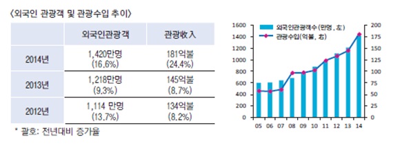 한편 지난해 2014년 우리나라를 방문한 외래관광객은 1420만명으로 역대 최대실적을 기록하였고 특히 홍보마케팅 강화, 비자제도 개선 등을 통해 중국인 관광객이 전년대비 41.6%가 증가한 612만명을 기록했다.
