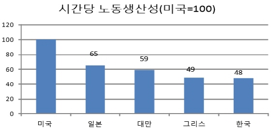 ▲ 미국 일본 대만 그리스 한국 등 각국의 시간당 노동생산성. /자료=컨퍼런스보드(2014) |