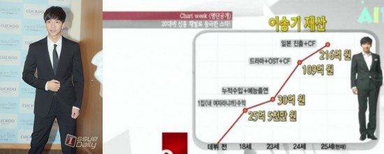 과거 한 프로그램에서 이승기의 재산을 측정, 25세 기준 재산 216억의 재산을 소유하고 있음을 예측했다. 이승기는 2012~2013년에 'CF의 황제'라고 불리며 관계자들 사이 가장 선호하는 CF모델로 선정된 바 있어 신빙성을 더했다.