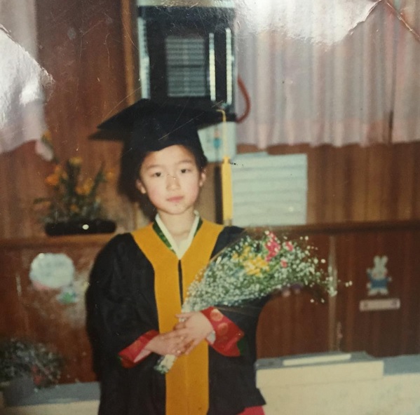 자신의 어릴적 모습으로 추정되는 사진 속에서 한유라는 가운을 입고 머리에는 학사모를 쓴 체 새침한 표정을 짓고있다. 또,한유라의 뽀얀 피부와 선한 눈매가 돋보인다.