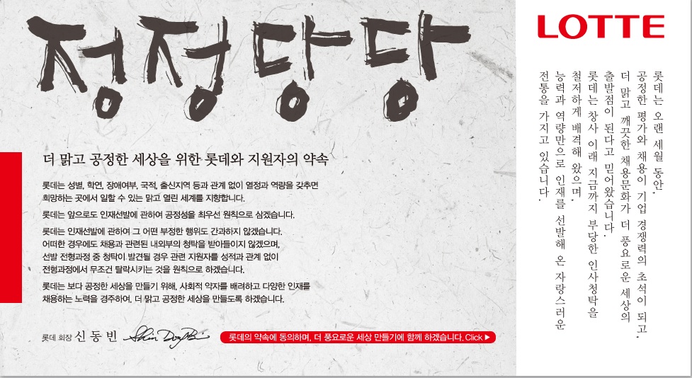 모집 분야는 식품, 관광, 서비스, 유통, 석유화학, 건설·제조, 금융 등 전 부문이다. 신입 공채 전형 절차는 ‘지원서 접수→서류심사→L-TAB(인·적성검사)및 면접전형’ 순으로 진행된다. 10월말 최종합격자를 발표할 예정이다.
