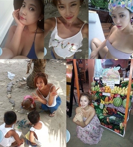 사진 속 황정음은 구릿빛의 건강한 피부와 연보라색 비키니, 꽃 수영모자, 현지 아이들과 노는 모습 등 등 휴가지에서 다양한 자신의 모습을 공개했다.