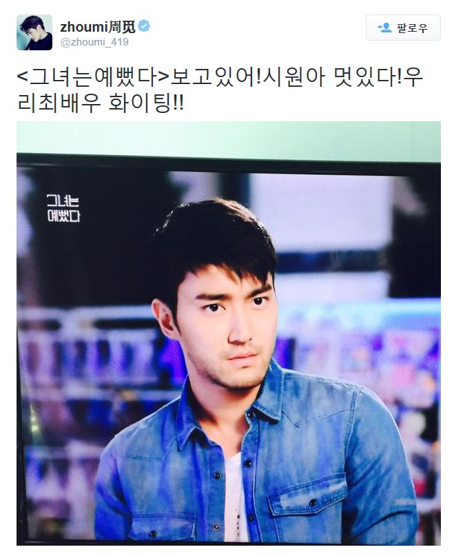 슈퍼주니어 조미는 17일 자신의 sns를 통해 "보고있어, 시원아 멋있다! 우리 최배우 화이팅"이라는 글과 함께 사진 한 장을 게재했다.