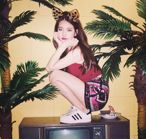 최근 수지는 자신의 SNS에 귀여운 이모티콘들과 함께 사진 한 장을 게재했다. 사진 속 수지는 고양이 머리띠를 착용하고 텔레비전 위에 올라가 앙큼한 표정을 취하고 있다.