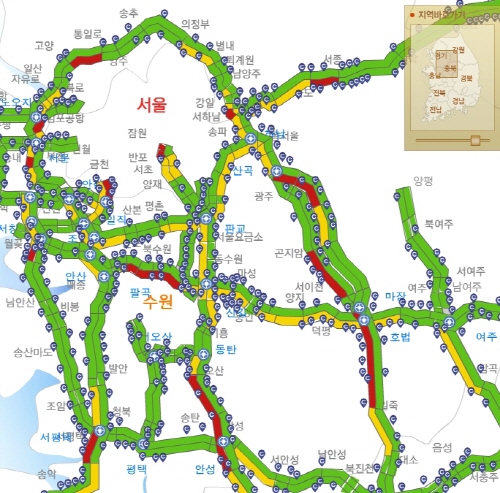 경부고속도로 망향휴게소는 혼잡하지만 안성휴게소와 기흥휴게소는 여유롭다. 경부고속도로의 차량 사고처리 및 고장처리 상황은 아래와 같다.