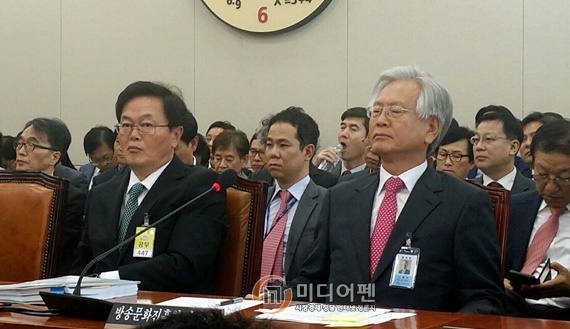 | ▲ 고영주 방송문화진흥회 이사장(오른쪽)은 6일 오후 국회에서 열린 국회 미래창조과학방송통신위원회 국정감사에 출석, 야당 의원들로부터 ‘문재인은 공산주의자’ 발언에 대한 사과 및 사퇴를 종용받았다./사진=미디어펜 |