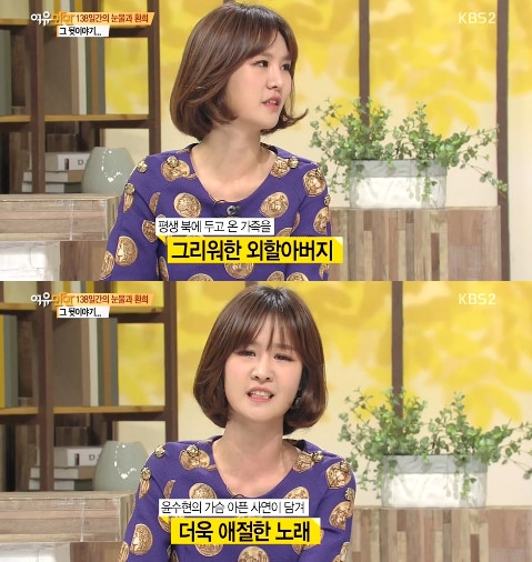 윤수현이 외할아버지가 이북 사람임을 고백, 이산 가족의 아픔을 공감했다.