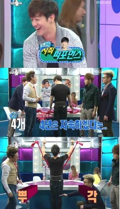 이에 MC들은 과거를 청산하자는 의미에서 사죄퍼포먼스를 제안했고 알렉스는 엉덩이 사이에 나무 젓가락을 끼고 부러뜨리는 충격적인(?) 동작을 선보였다. 알렉스는 민망해하면서 "차라리 발을 닦으라 그래"라고 하며 출연진들을 폭소케했다.