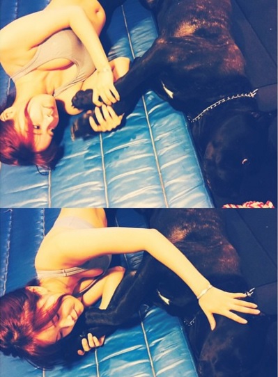 조현영은 공개된 사진 속에서 몸매가 훤히 드러나는 트레이닝복을 입고 매트에 누워있다. 강아지의 몸을 어루만지는 모습이 돋보인다.