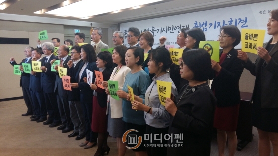 ▲ 23일 서울 한국프레스센터 19층 기자회견장에서 좋은교과서만들기시민연대는 출범 기자회견을 갖고 “좋은 역사교과서, 정직한 역사교과서, 올바른 역사교과서를 만들기 위한 시민연대를 출범한다”고 선포했다./사진=미디어펜 |